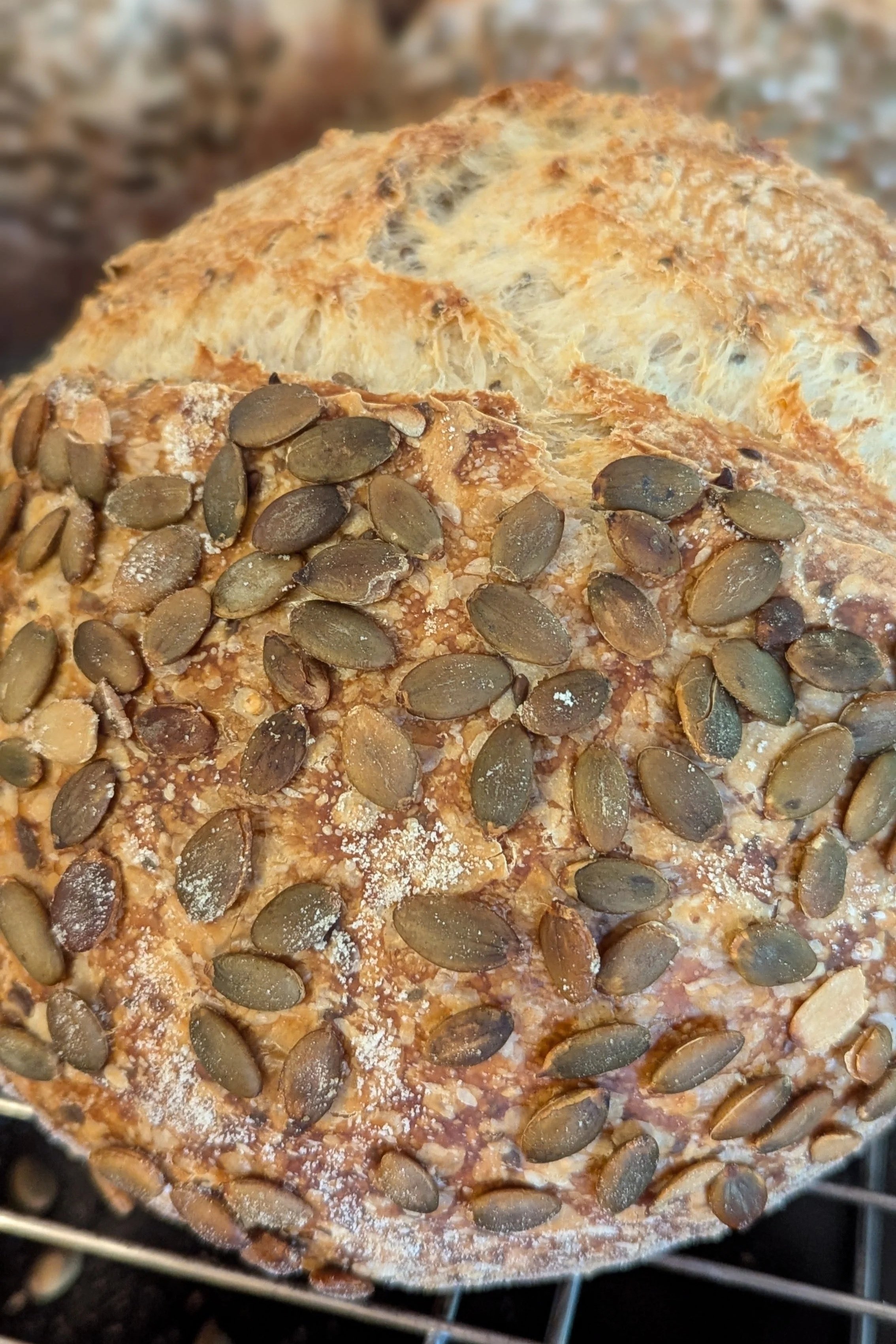 Seeded | Soft, lacey crumb | Nutty flavour | Pumpkin seed-coated | Organic